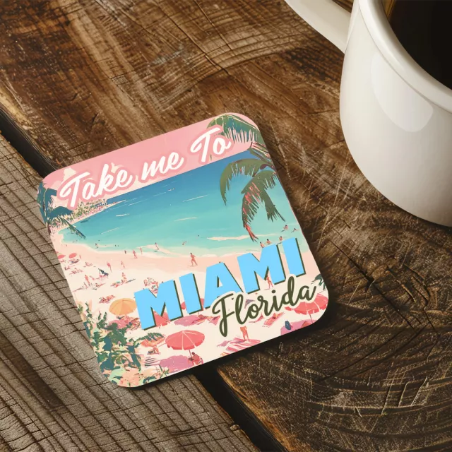 Take Me To Miami Florida Square Coaster 4-Piece Set – Miami Beach Coasters for Drinks – Retro Summer Coffee Tea Mug Coasters